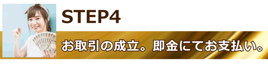 ご提示させていただきました買取金額にご納得いただけましたら、手続き書類にサイン頂き、その場で現金をお支払いさせていただきます。 本人確認資料(身分証明書)を確認させて頂きまして、ご住所、氏名、ご年齢など弊社指定の書類に簡単にご記入頂きます。(※ご本人の許可なく第三者に個人情報を開示または提供することは原則的に致しません。)